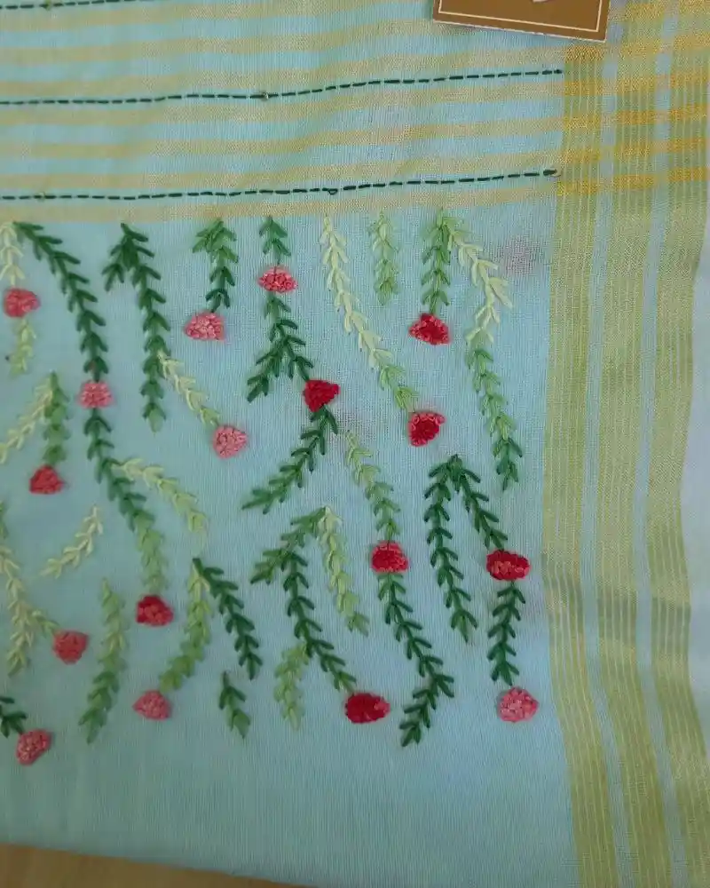 A maroon handloom pure cotton saree with handmade hand embroidery sounds absolutely exquisite! Handloom sarees are known for their craftsmanship and elegance, while hand embroidery adds a personal touch and intricate beauty to each piece.