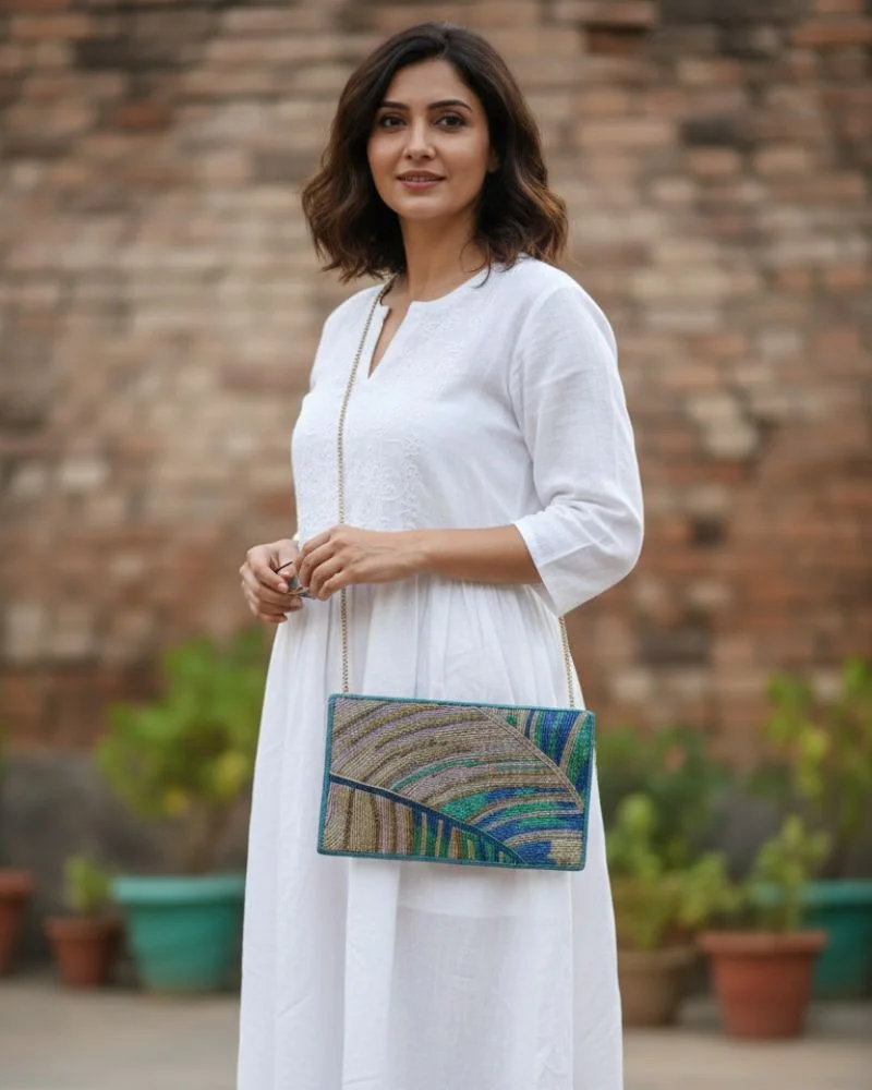 This beautiful bag, made by threading each bead onto the needle of Aari, is truly a work of art. Products crafted by women like these not only support the local economy but also serve as a means of empowerment and independence for women.